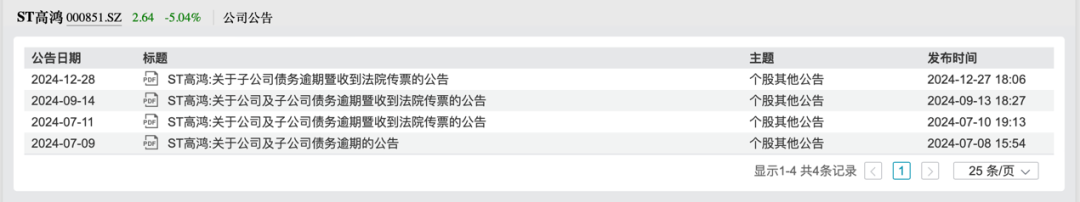 近年来,ST高鸿自身“造血”能力堪忧,持续经营能力备受考验。2019年至2023年,公司扣非净利润连续五年为负,分别为-2.51亿元、-1.96亿元、-2.17亿元、-2.77亿元、-15.89亿元。2024年下半年以来,公司还频频披露债务逾期公告。