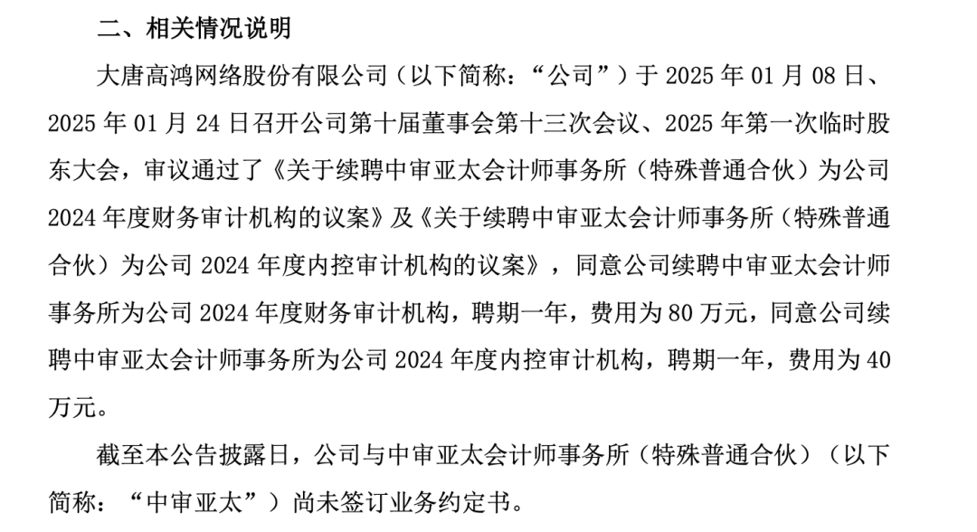 此前,ST高鸿曾于2025年1月相继召开董事会、临时股东大会,审议通过续聘中审亚太为公司2024年度财务审计机构、内控审计机构,聘期一年,聘请费用分别为80万元、40万元。