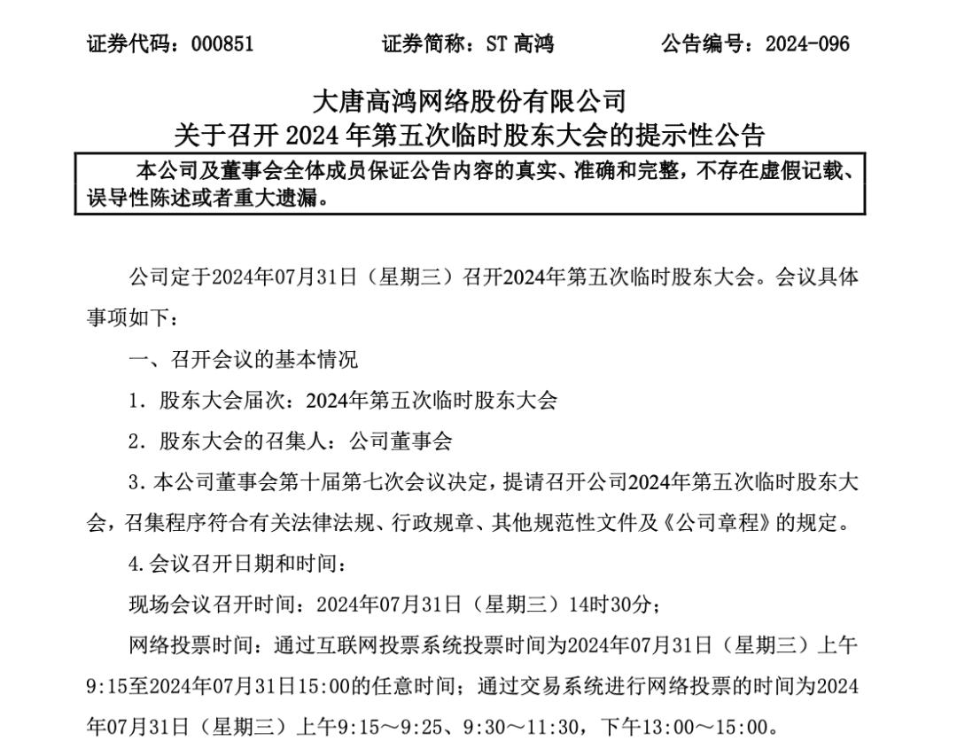ST高鸿将自救希望寄托在重整上。2024年7月11日,公司公告称,由于无法清偿到期债务,且明显缺乏清偿能力,但具有重整价值,因此拟向法院申请重整及预重整,希望通过重整能够避免公司债务风险及经营风险的进一步恶化。同年7月31日,申请预重整及重整的议案在股东会上获得通过。